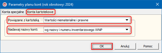 2. Przejść na zakładkę Konta kartotekowe i w polu Powiązane z kartoteką wybrać wartość Wartości niematerialne i prawne, a w polu Nadawaj nazwy kont wskazać wg nazwy i numeru inwentarzowego WNiP. Ustawienie zapisać przyciskiem OK.