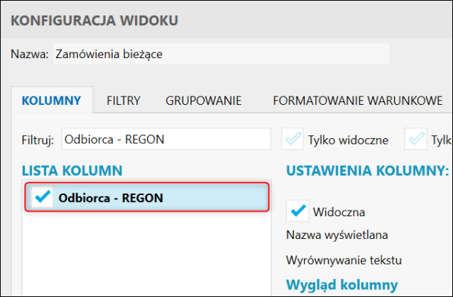 Aby pokazać kolumnę Odbiorca – REGON, należy: