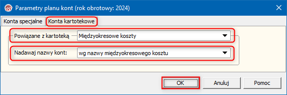 2. Przejść na zakładkę Konta kartotekowe i w polu Powiązane z kartoteką wybrać wartość Międzyokresowe koszty, a w polu Nadawaj nazwy kont wskazać wg nazwy międzyokresowego kosztu. Ustawienie zapisać przyciskiem OK.