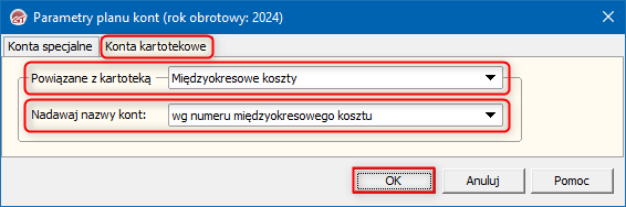 2. Przejść na zakładkę Konta kartotekowe i w polu Powiązane z kartoteką wybrać wartość Międzyokresowe koszty, a w polu Nadawaj nazwy kont wskazać wg numeru międzyokresowego kosztu. Ustawienie zapisać przyciskiem OK.