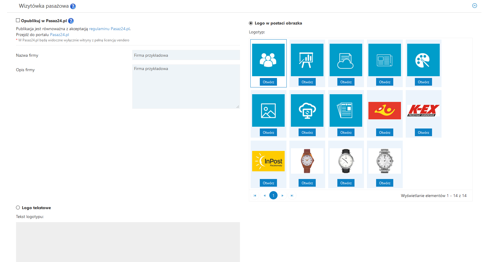Rozwinięcie wskazanego modułu sprawi, że pojawi się w nim menu z Nazwą i Opisem firmy domyślnie zaczerpniętym z danych podmiotu. Oczywiście zarówno wyświetlaną nazwę, jak i opis można dowolnie zmodyfikować. Wskazane jest też wybranie logotypu w postaci zaczytanych do vendero obrazów lub też wybranego tekstu.