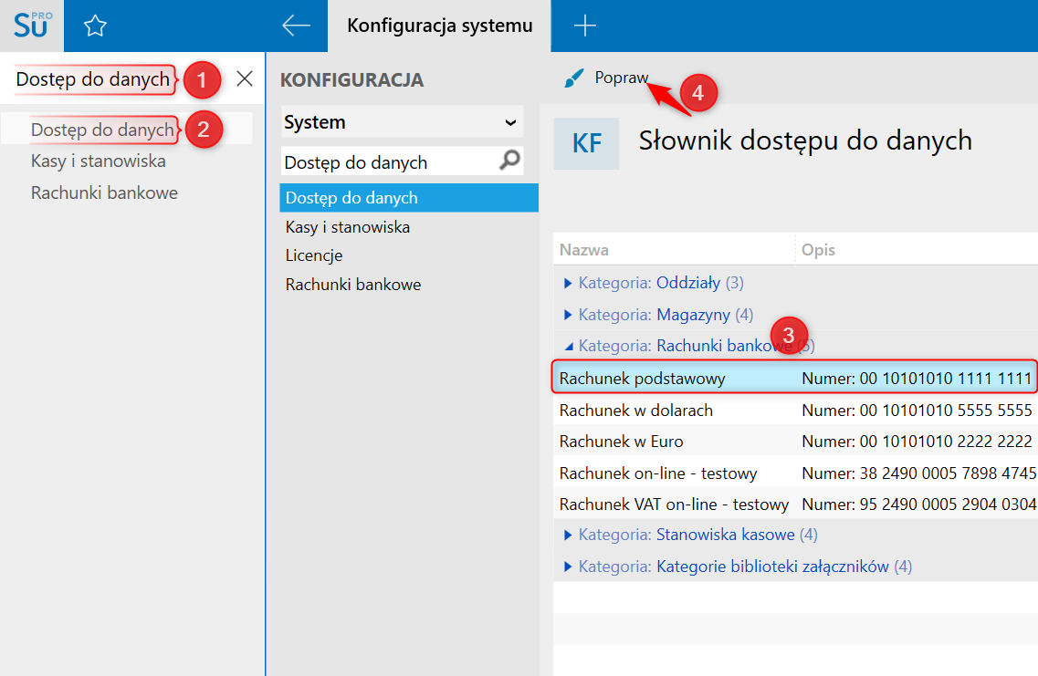 1. W lewym, górnym rogu programu, w wyszukiwarce wpisać Dostęp do danych, wejść w wyszukany moduł, zaznaczyć odpowiedni Rachunek bankowy i kliknąć górne menu Popraw.