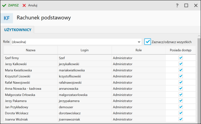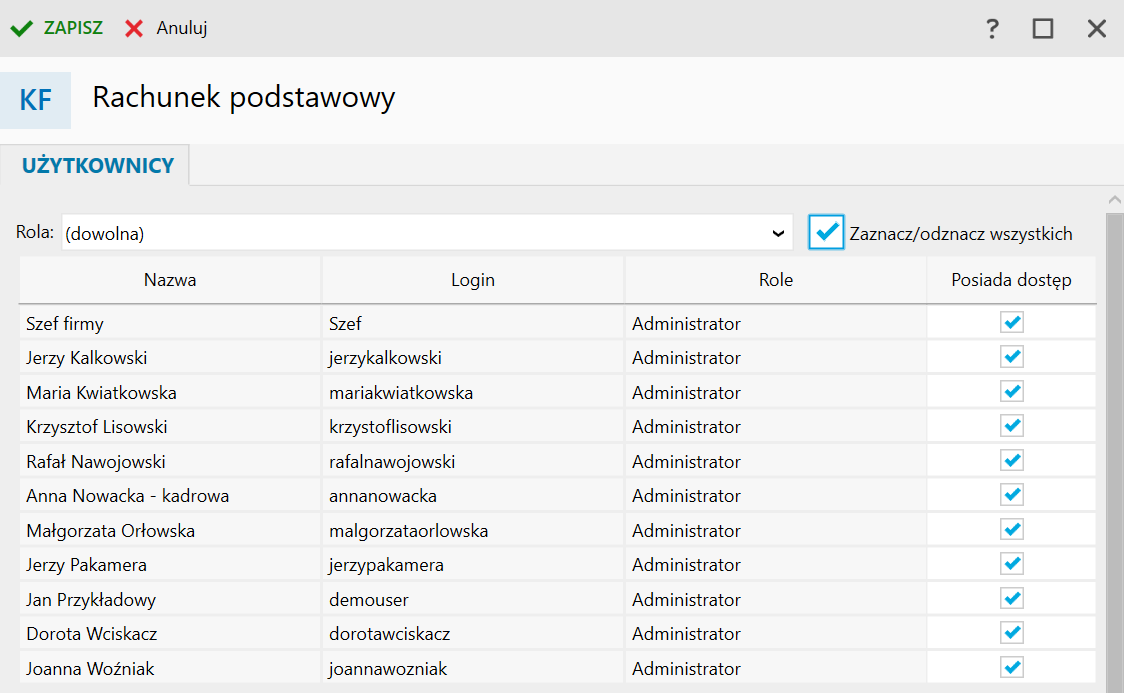 W tym oknie można skorzystać z filtracji użytkowników poprzez przypisane do nich Role oraz skorzystać z opcji Zaznacz/odznacz wszystkich.