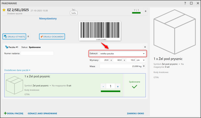 Przy przedstawionej konfiguracji automatu, zeskanowanie graficznego kodu kreskowego zawierającego nazwę gabarytu spowoduje automatyczne ustawienie gabarytu paczki w oknie Pakowanie.