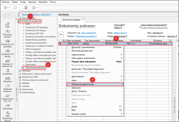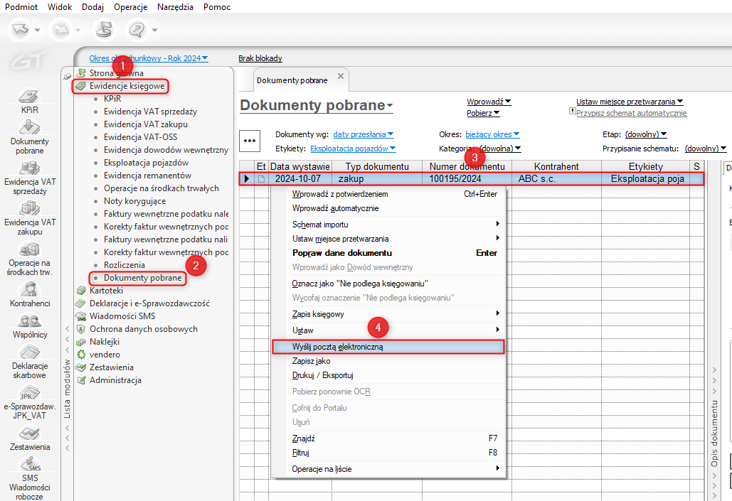 1. Z listy modułów wybrać Ewidencje księgowe – Dokumenty pobrane, kliknąć dokument, który ma zostać wysłany e-mailem Prawym Przyciskiem Myszy i wybrać opcję Wyślij pocztą elektroniczną.