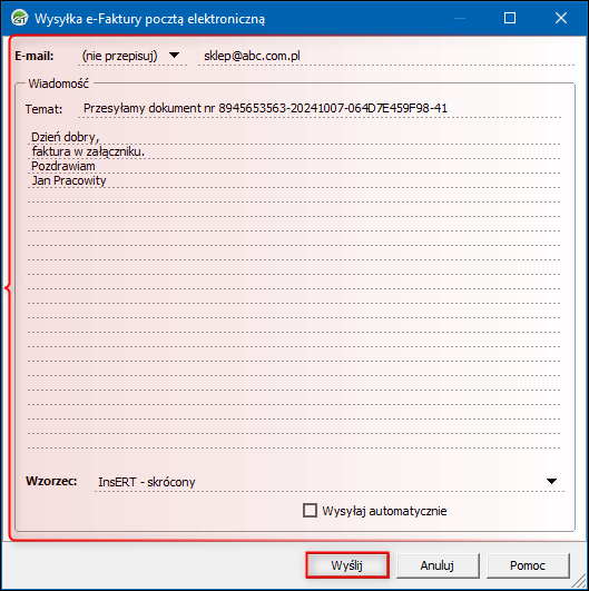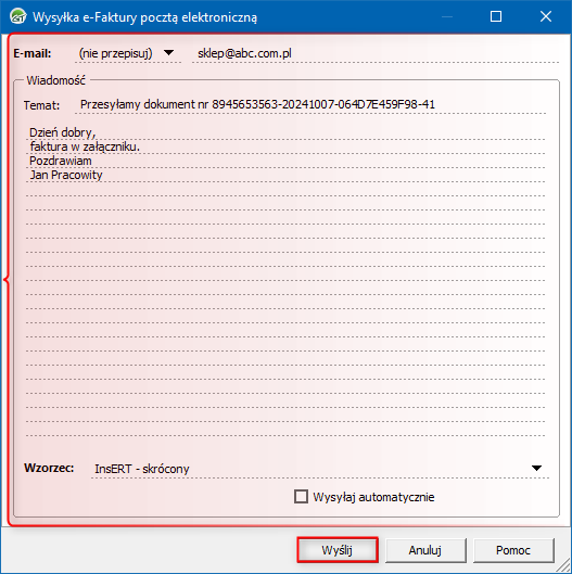 2. W oknie wysyłka e-Faktury pocztą elektroniczną wprowadzić adres E-mail, na który zostanie wysłana wiadomość. Można go też przepisać z danych podmiotu lub kontrahenta. Pole Temat zostanie automatycznie uzupełnione, jednak pole to jest edytowalne. Poniżej można uzupełnić również treść wiadomości oraz wybrać Wzorzec, według którego zostanie wygenerowany dokument w załączniku. Po uzupełnieniu danych wysłać wiadomość przyciskiem Wyślij.