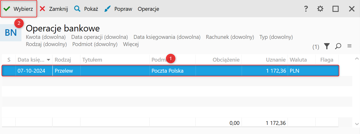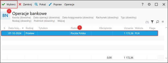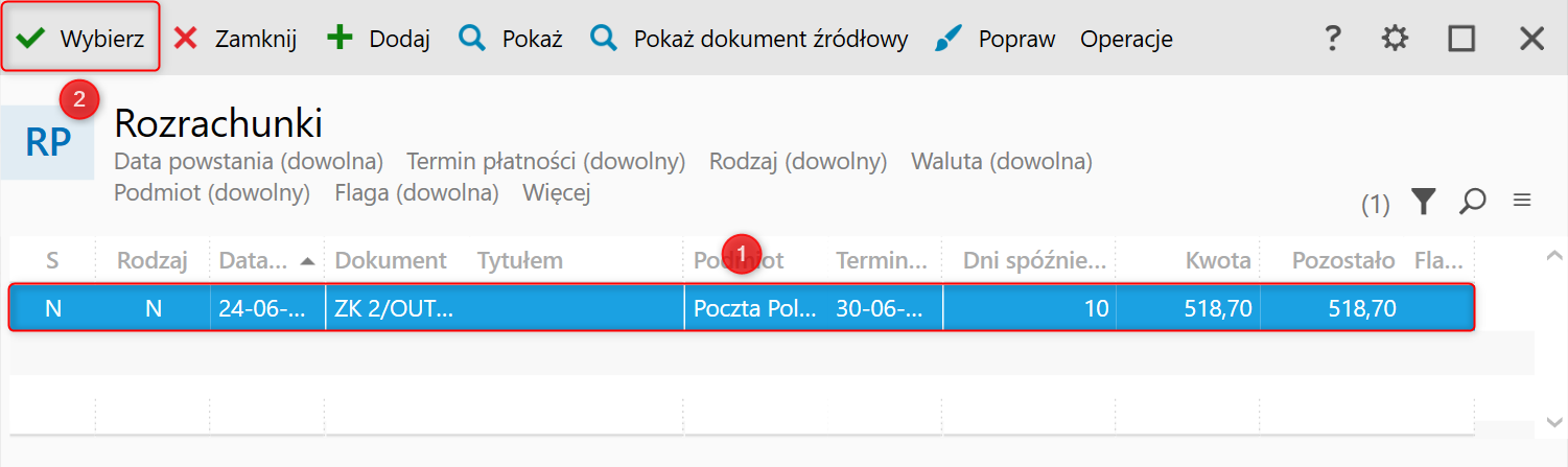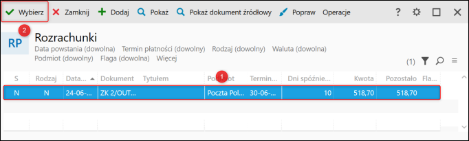 5. Po wskazaniu odpowiedniego Rozrachunku zatwierdzić wybór przyciskiem Wybierz.