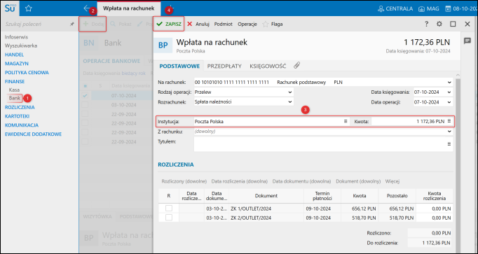 1. Po otrzymaniu opłaty od Cesjonariusza udokumentować ją poprzez ręczne dodanie Operacji bankowej bądź wczytanie Wyciągu bankowego.