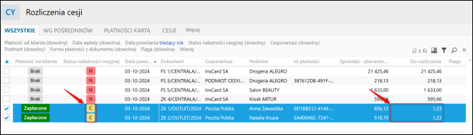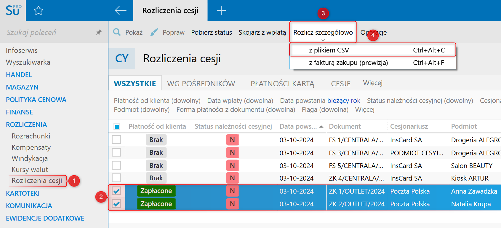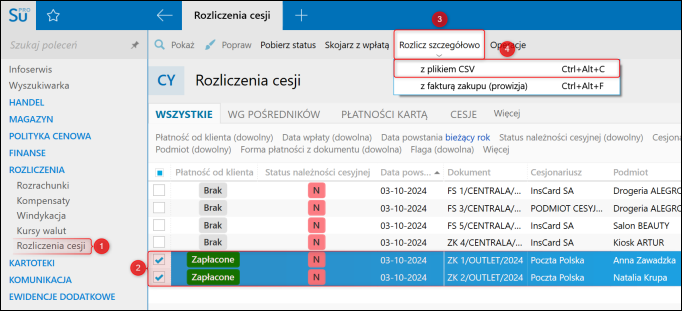 2. Przejść do modułu Rozliczenia cesji, zaznaczyć pozycję do rozliczenia, a następnie wybrać Rozlicz szczegółowo – z plikiem CSV.