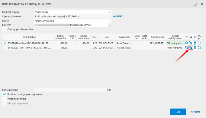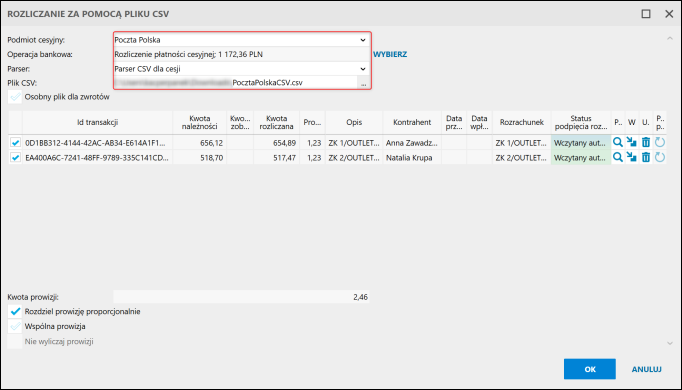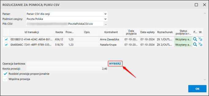 3. Wybrać Parser dla płatności cesyjnych, wskazać Podmiot cesyjny i otrzymany od niego Plik CSV. Następnie wskazać wcześniej utworzoną Operację bankową. Odczytane pozycje pojawią się na liście.