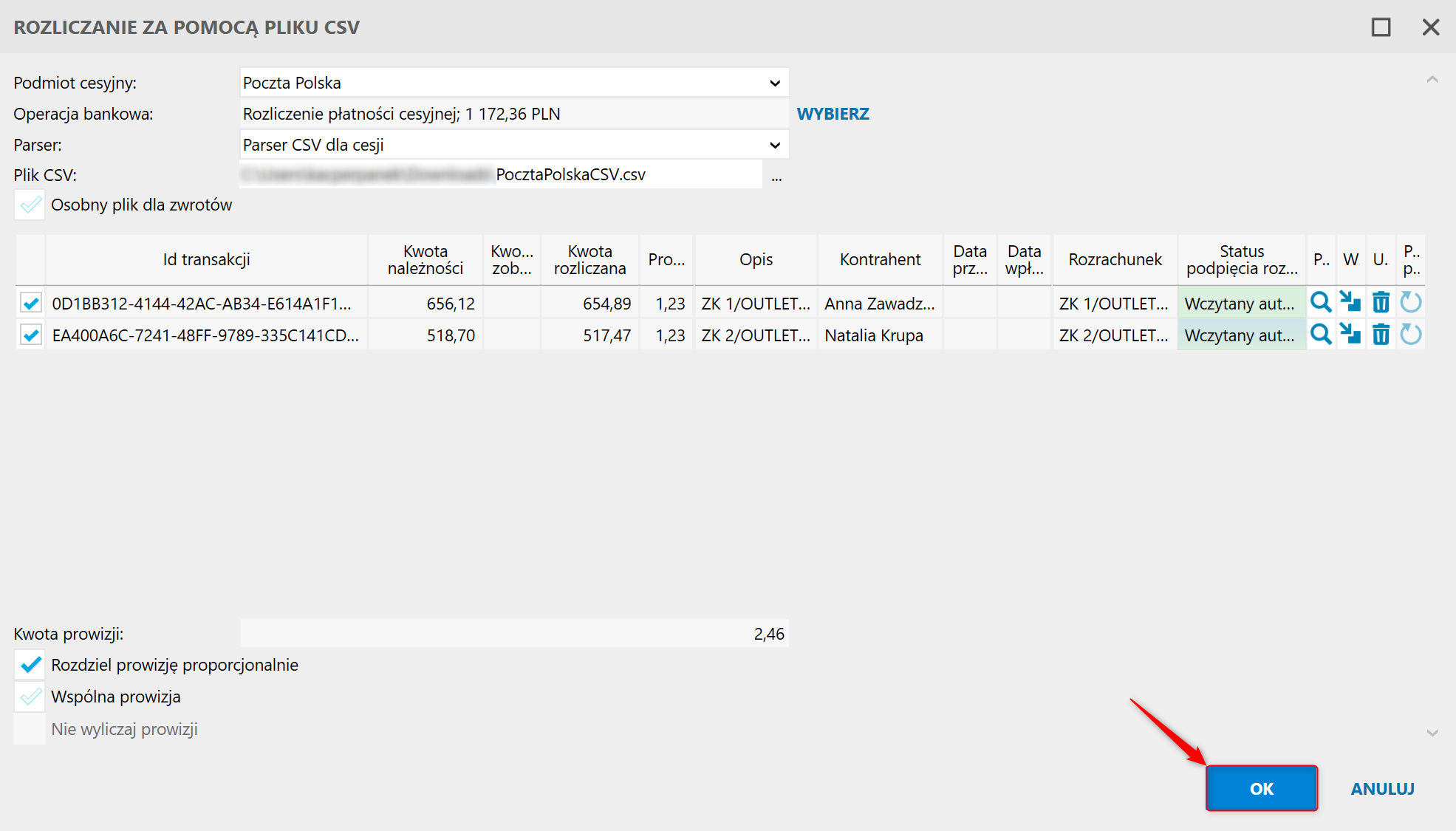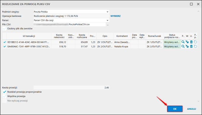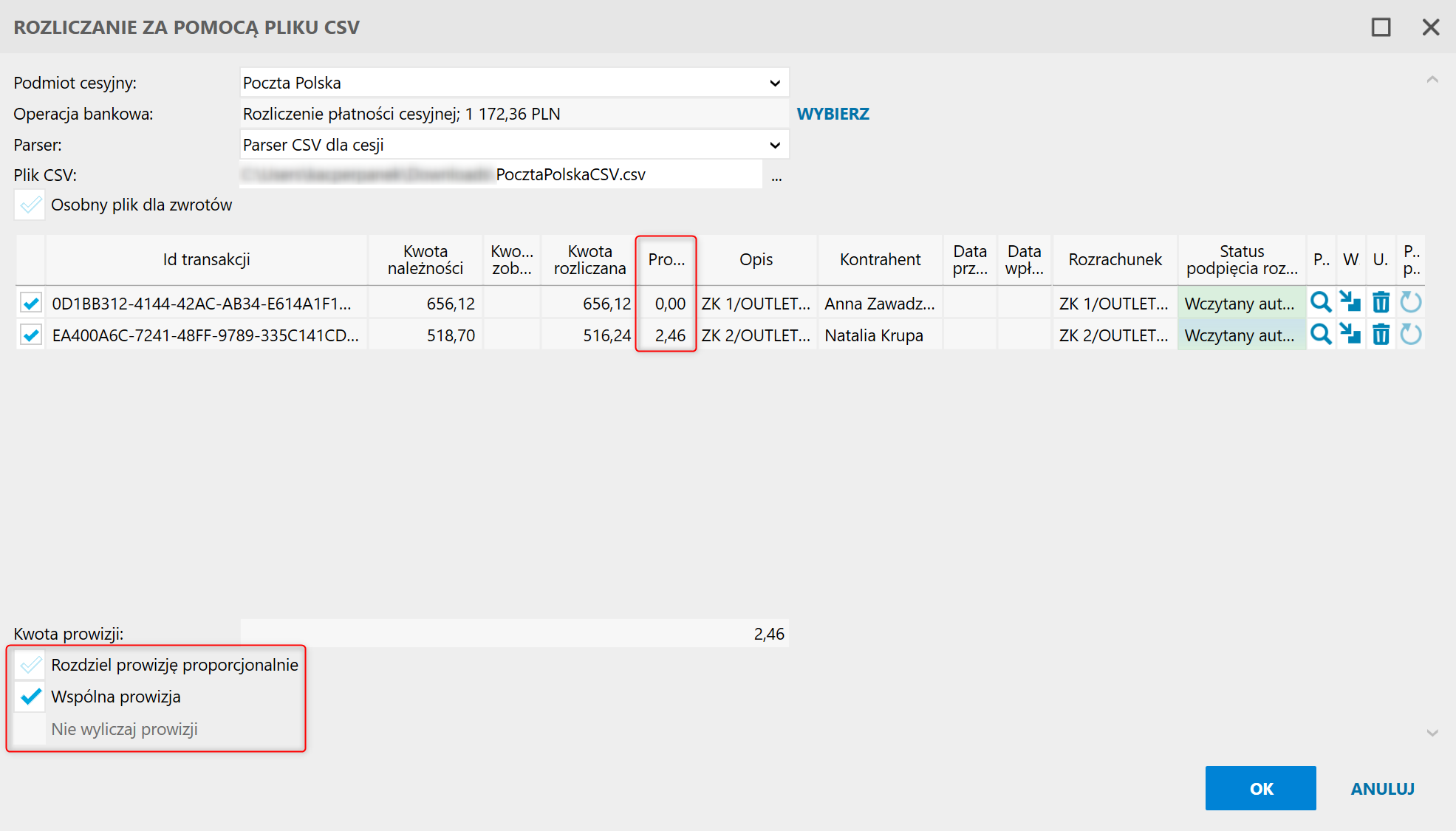 6. Checkboxy widoczne pod Kwotą prowizji pozwalają na zdecydowanie, czy powinna ona zostać rozdzielona proporcjonalnie, czy przypisana do jednej pozycji.