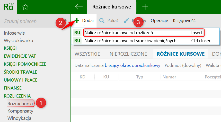 1. Przejść do modułu Rozrachunki wybrać zakładkę Różnice kursowe, a następnie z górnego menu Dodaj wybrać Nalicz różnice kursowe od rozliczeń.