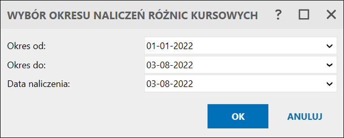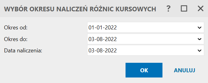 2. Wskazać Okres od i do oraz Datę naliczenia. Zatwierdzić przyciskiem OK.