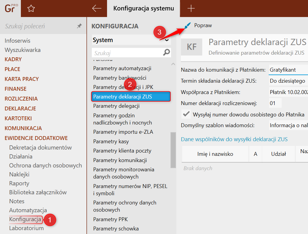 1. Przejść do modułu Ewidencje dodatkowe  Konfiguracja  Parametry deklaracji Z​US, a następnie w górnym menu kliknąć Popraw.