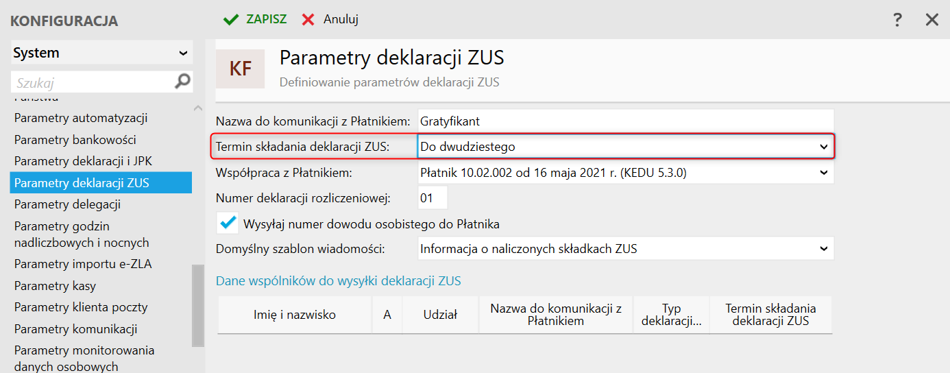 2. W polu Termin składania deklaracji ZUS wybrać jedną z dostępnych opcji z listy rozwijanej, a zmiany zatwierdzić przyciskiem Zapisz.​