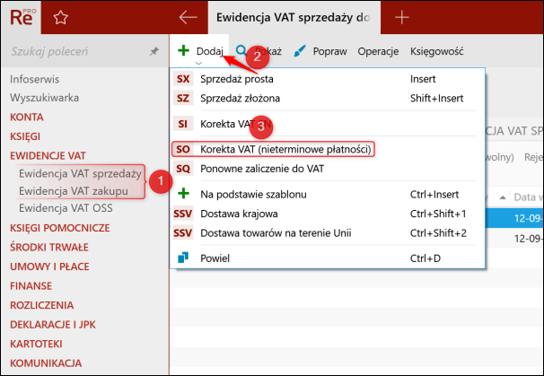 1. Przejść do modułu Ewidencja VAT sprzedaży/zakupu, rozwinąć górne menu Dodaj i wybrać Korekta VAT (nieterminowe płatności).