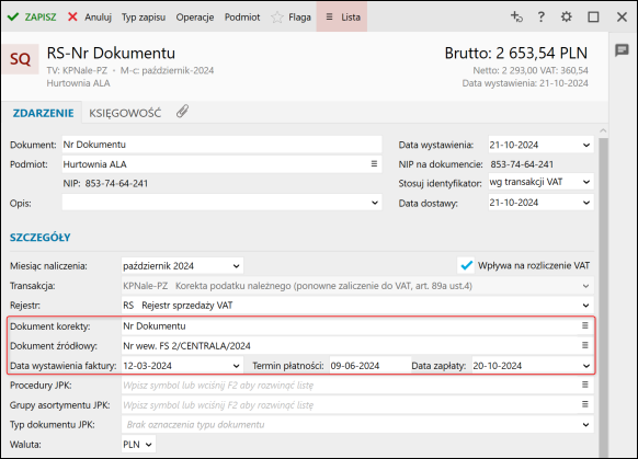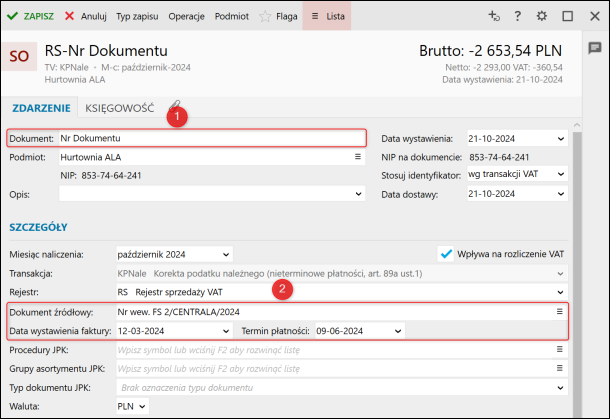2. Na przykładzie korekty VAT od dokumentu sprzedaży, uzupełnić pole Dokument, wybrać Dokument źródłowy i uzupełnić Datę wystawienia faktury i Termin płatności.