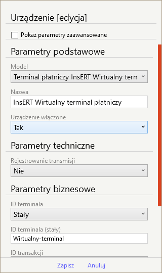 3. Po otwarciu się okna konfiguracji sterownika dla danego urządzenia, należy wprowadzić, na jakim porcie urządzenie jest podłączone do tego komputera oraz wypełnić pozostałe informacje np. Identyfikator terminala. Po skonfigurowaniu zatwierdzić przyciskiem Zapisz.