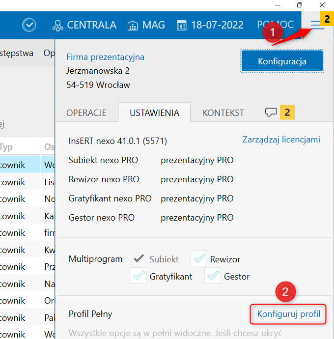 Uwaga! W momencie, gdy w programie jest włączony profil o nazwie Mała firma, moduł Urządzenia jest niewidoczny. Aby go uruchomić, należy zaaplikować ustawienia Pełne lub w konfiguracji profilu włączyć obsługę danego urządzenia. Informację dotyczącą konfiguracji sposobu wyświetlania modułów można naleźć tutaj​.​​