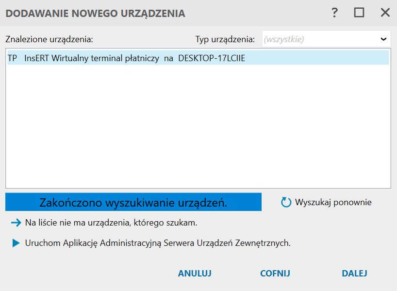 7. Po wybraniu jednej z opcji program wyszuka terminal, a następnie należy wybrać go z listy i przejść Dalej.