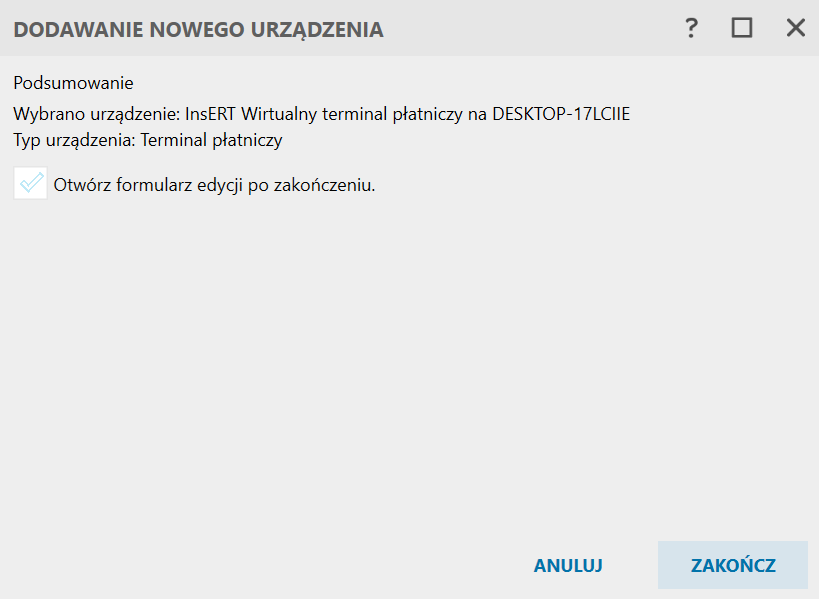 8. Okno zatwierdzić przyciskiem Zakończ. Jeżeli nie ma dodanej formy płatności Płatność kartą przy sprzedaży, należy ją dodać. Aby to zrobić, proszę zapoznać się z tematem Jak dodać formę płatności Karta płatnicza przy sprzedaży w InsERT nexo?