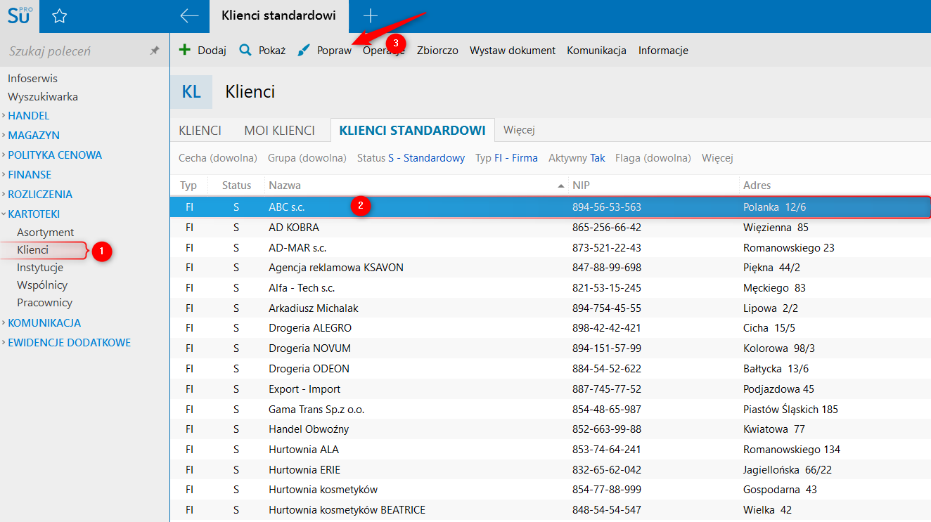 1. Przejść do modułu Kartoteki – Klienci, zaznaczyć pozycję na liście i wybrać Popraw.