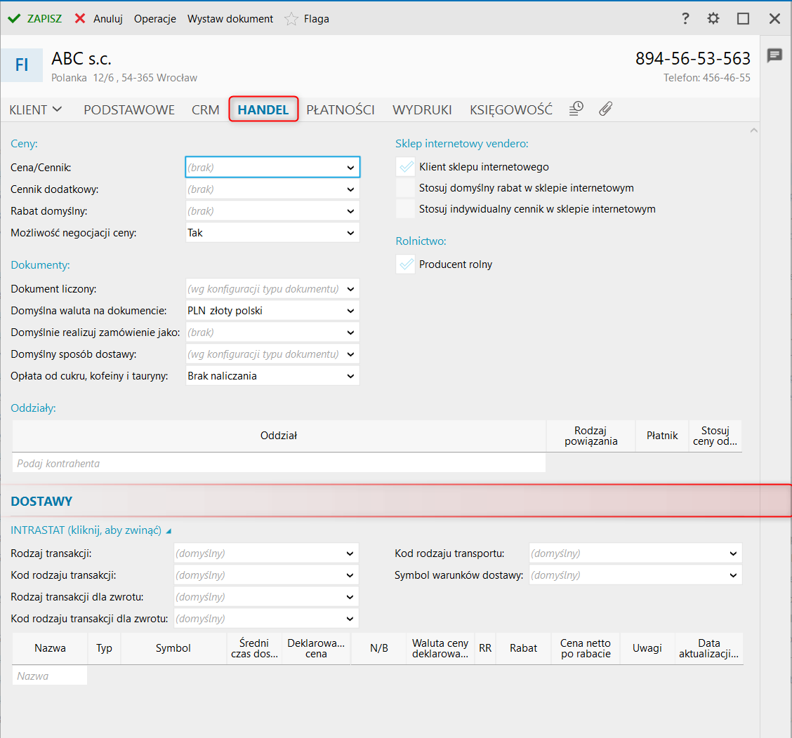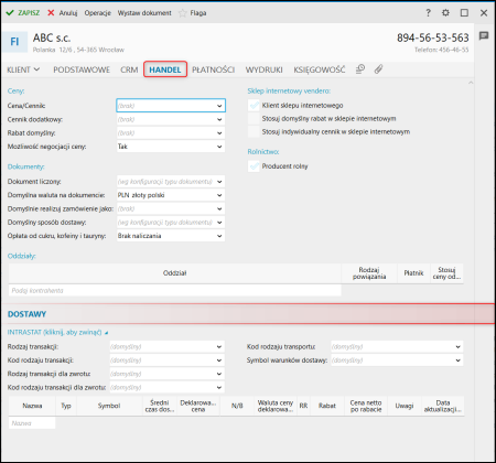 2. Na zakładce Handel w sekcji Dostawy uzupełnić domyślne wartości opisu pozycji do deklaracji INTRASTAT dla pól:
