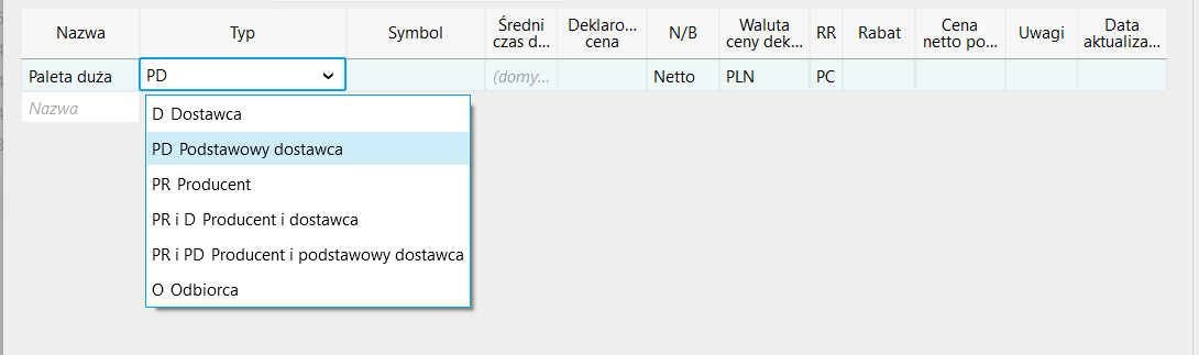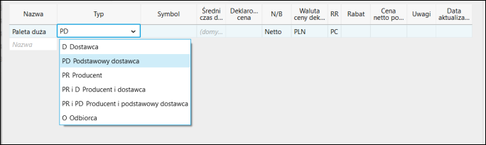 Wszystkie te wartości, a także domyślny kraj pochodzenia dla każdego asortymentu można również określić w znajdującej się poniżej tabeli dostaw.