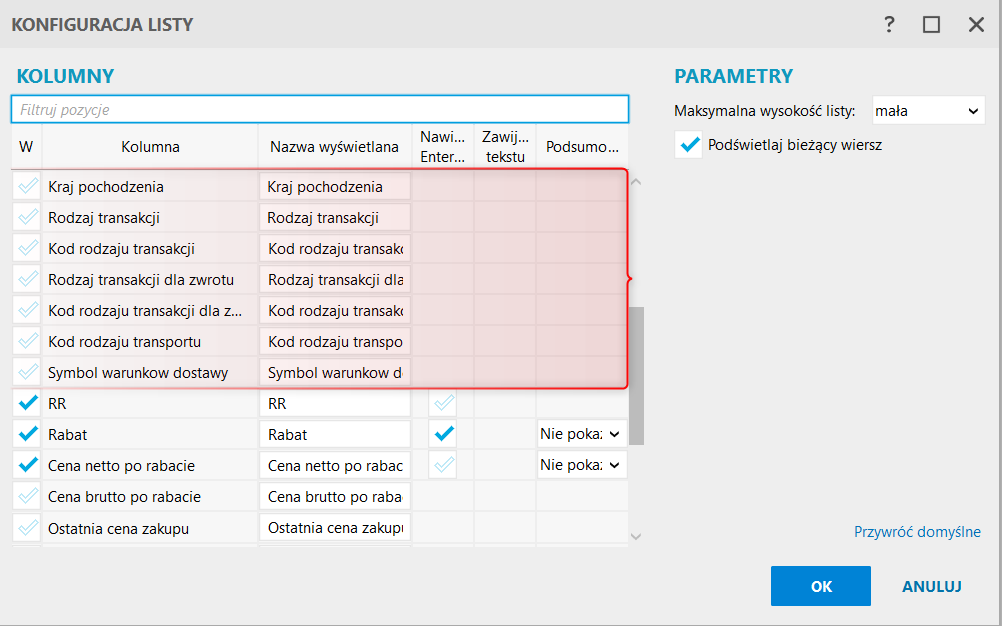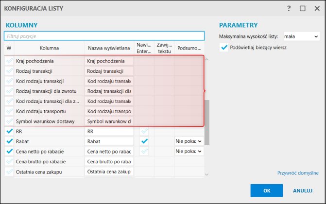 Kolumny dotyczące INTRASTAT (domyślnie niewidoczne) można dodać w konfiguracji listy tabeli dostaw (PPM – Konfiguracja listy).