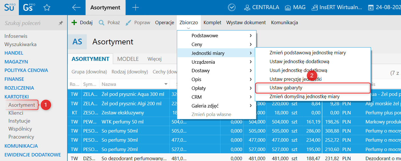 Gabaryty towaru można dodać zbiorczo z modułu Asortyment lub edytując konkretny towar. W pierwszej kolejności zostanie omówiony przykład zbiorczego przypisania parametru. W tym celu należy: