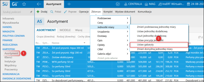 1. Zaznaczyć towary na liście, a następnie z górnego menu Zbiorczo wybrać Jednostki miary i Gabaryty.