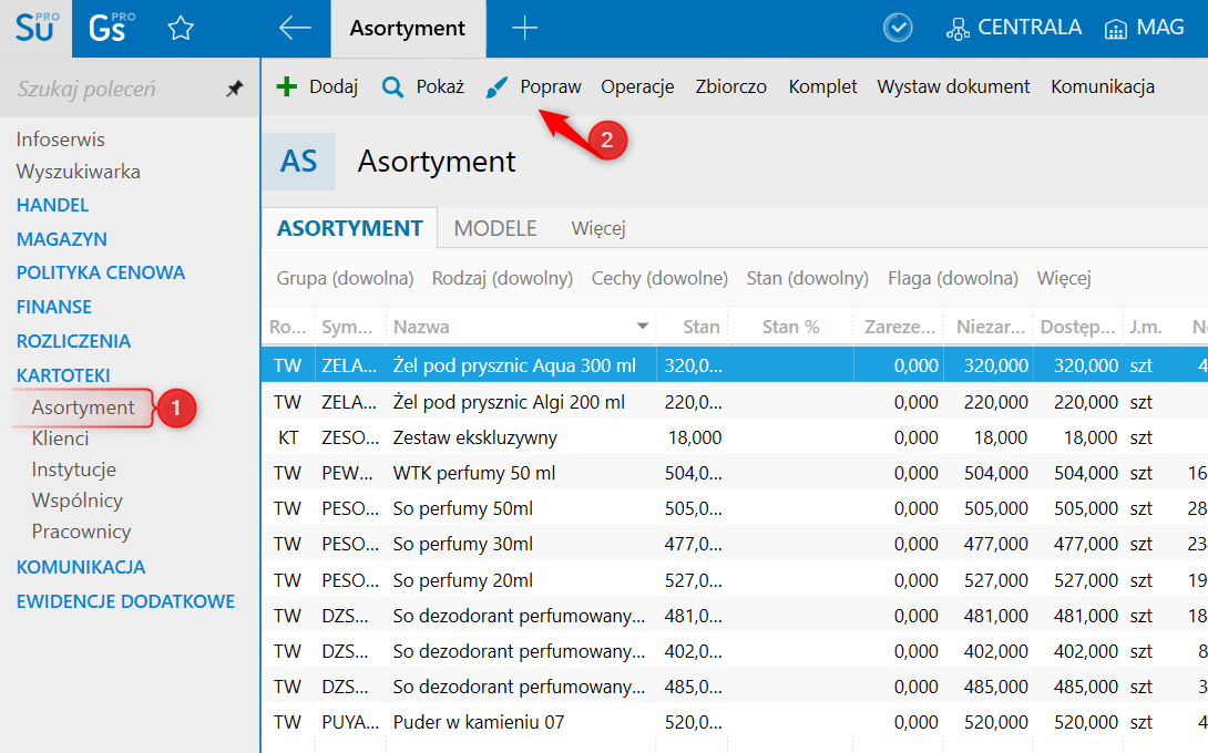 1. Przejść do modułu Asortyment na liście zaznaczyć towar i kliknąć Popraw.