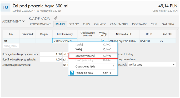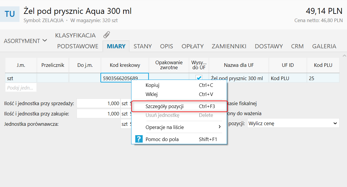 3. W dowolnym polu tabeli kliknąć prawym przyciskiem myszy i przejść do szczegółów pozycji.