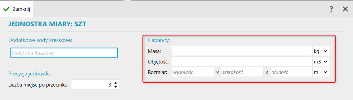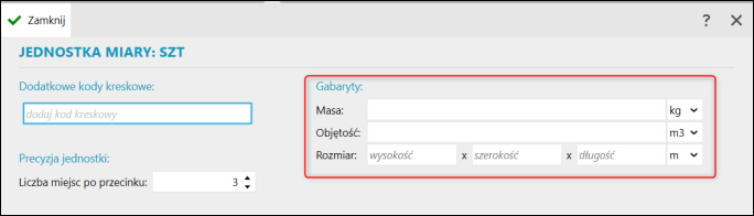 4. Sekcja Gabaryty umożliwi wprowadzenie parametrów tj. Masa, Objętość czy Rozmiar. Okno należy zatwierdzić przyciskiem Zamknij, a następnie Zapisać kartotekę asortymentu.
