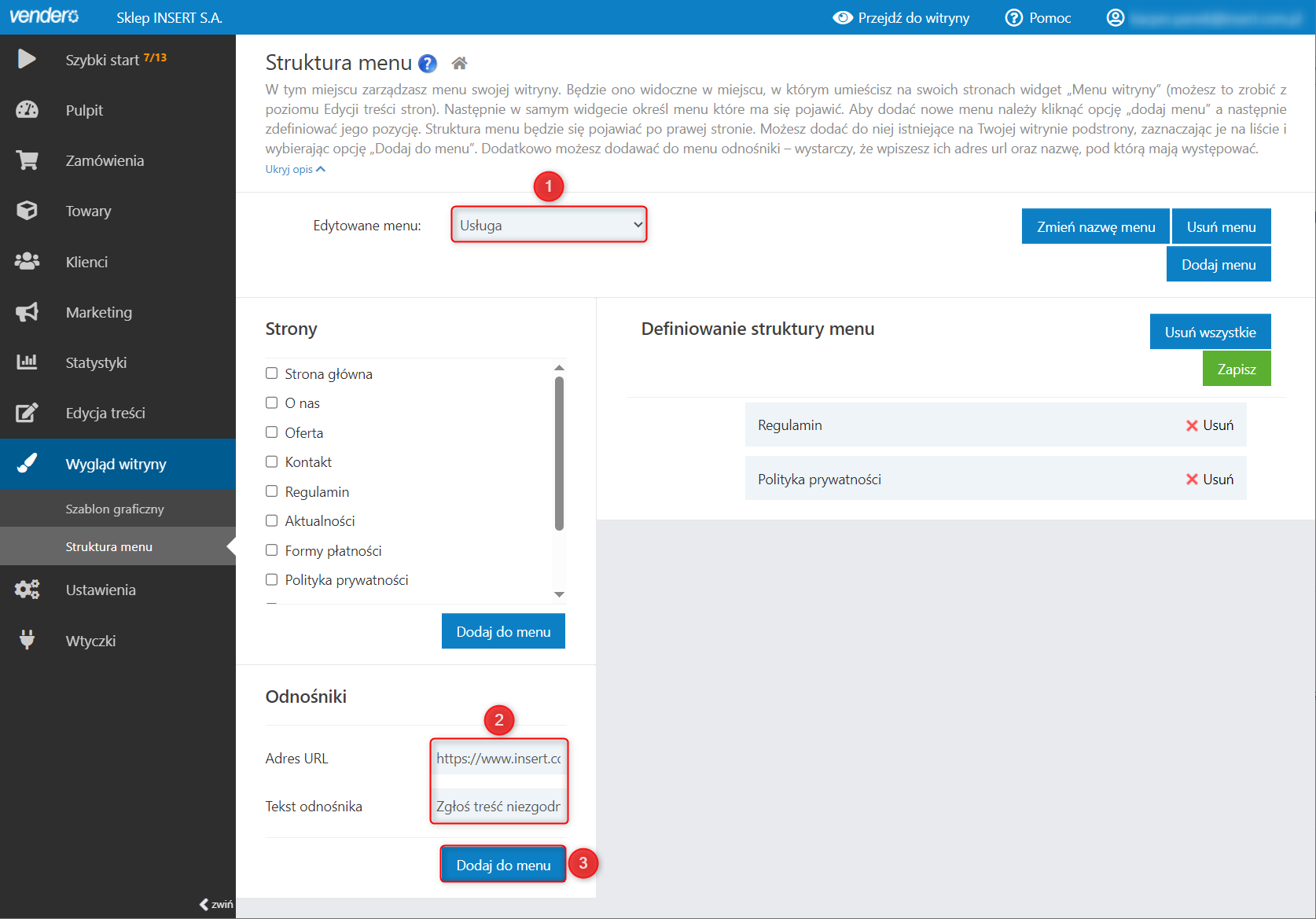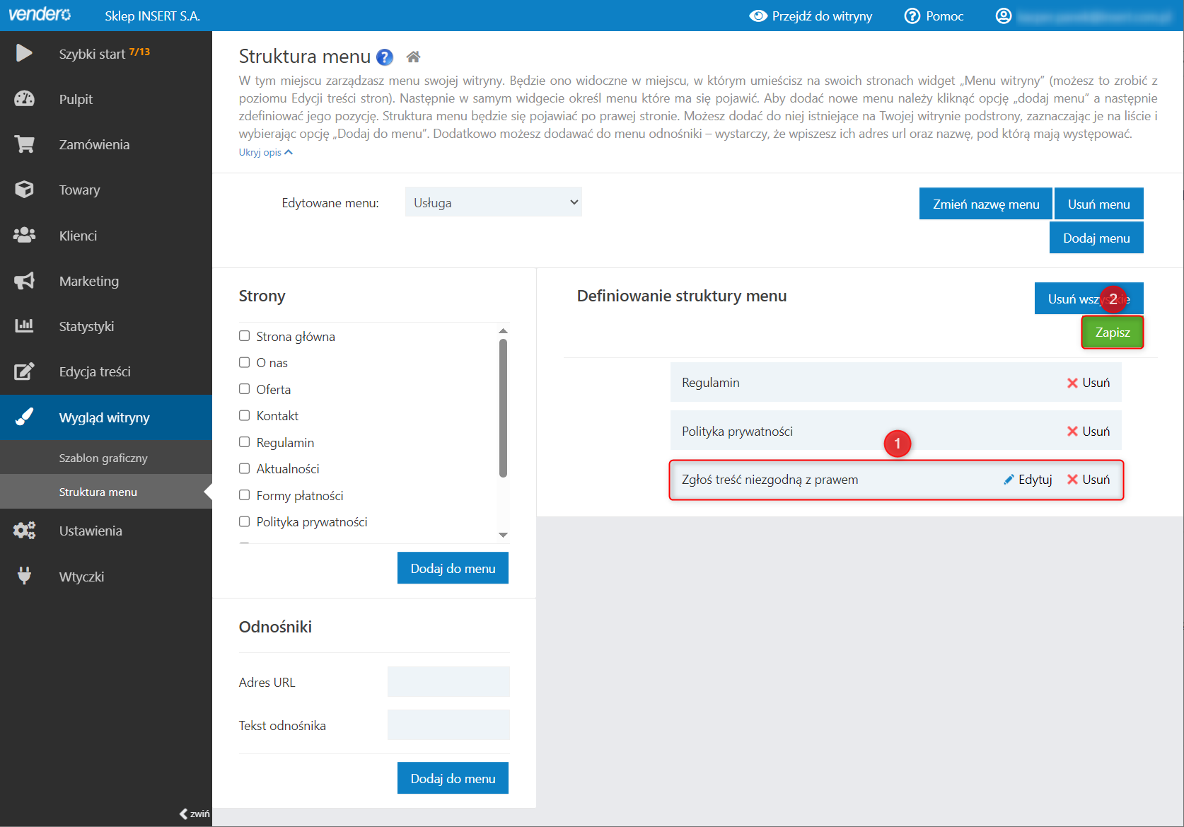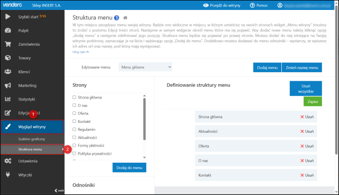 1. Przejść do Panelu administracyjnego vendero, a następnie kliknąć Wygląd witryny – Struktura menu​.