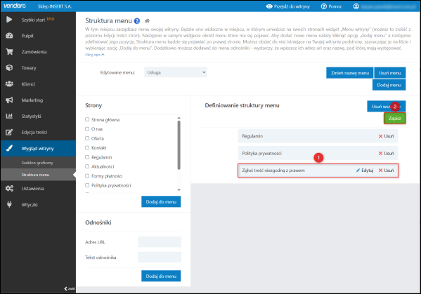 3. Utworzony odnośnik pojawi się w sekcji Definiowanie struktury menu​, gdzie później będzie można go edytować bądź usunąć. Zatwierdzić zmiany przyciskiem Zapisz.