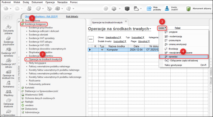 1. Z listy modułów wybrać Ewidencje księgowe – Operacje na środkach trwałych, na następnie dodać lub poprawić dokument SP lub LT.