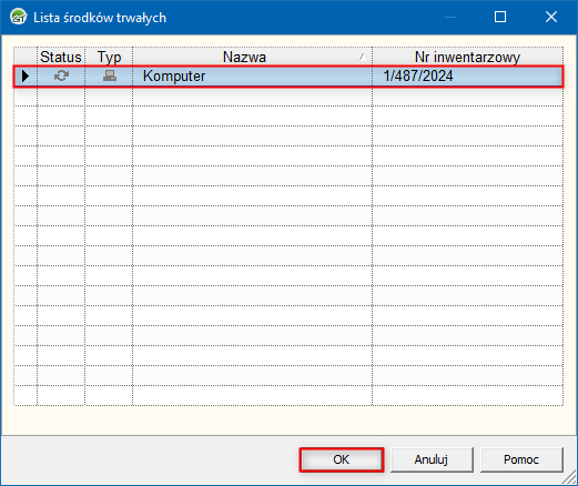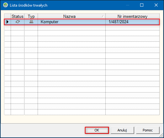 2. W przypadku dodania dokumentu wskazać środek trwały, którego dotyczy.