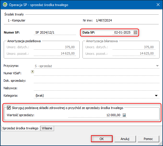 3. Jeżeli data dokumentu jest późniejsza niż 31.12.2024 r. to zostanie wyświetlona opcja Skoryguj podstawę składki zdrowotnej o przychód ze sprzedaży środka trwałego, którą należy zaznaczyć oraz wprowadzić Wartość sprzedaży. Zapisać przyciskiem OK.