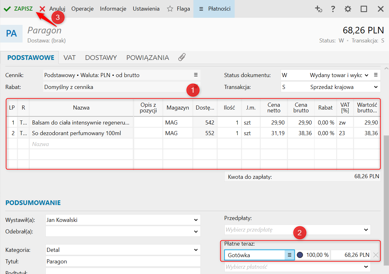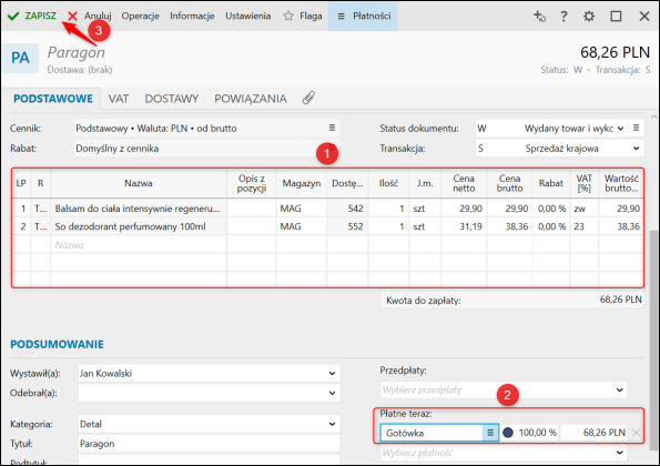 2. W omawianym przykładzie został wybrany zwykły Paragon. Po wprowadzeniu towarów na paragon oraz wybraniu płatności okno należy zatwierdzić przyciskiem Zapisz.