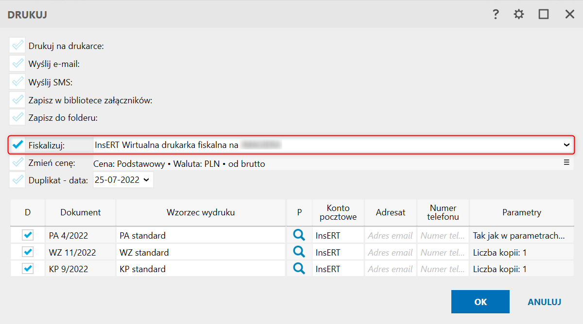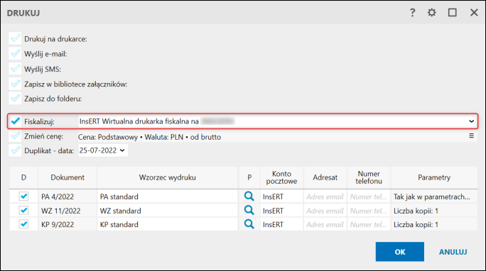 3. W oknie Drukuj program pozwoli na fiskalizację dokumentu. Jeżeli drukarka fiskalna nie została skonfigurowana z programem, należy ją dodać. Cała procedura opisana jest w innym artykule e-Pomocy (tutaj). Przycisk OK zafiskalizuje dokument oraz wydrukuje dokumenty powiązane, jeżeli zostały zaznaczone.