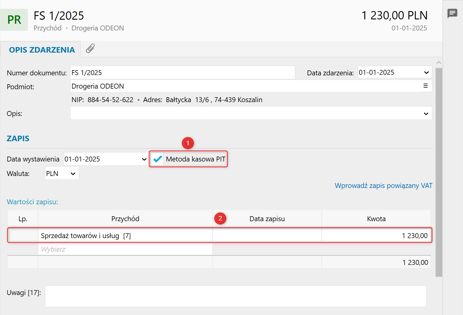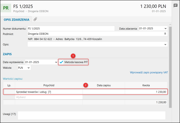 2. Po zaznaczeniu Metody kasowej PIT w sekcji Wartości zapisu będzie możliwość wybrania kolumn oraz kwot zapisu w KPiR.