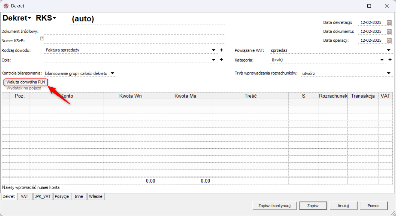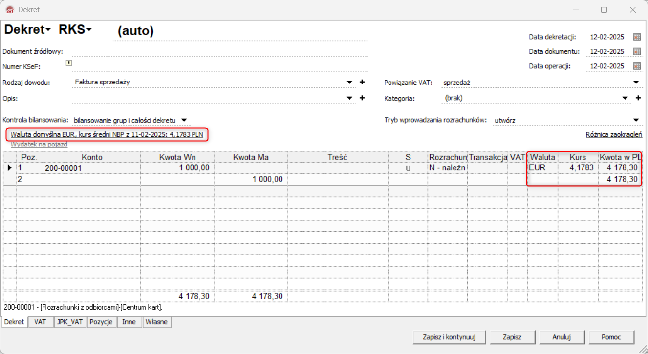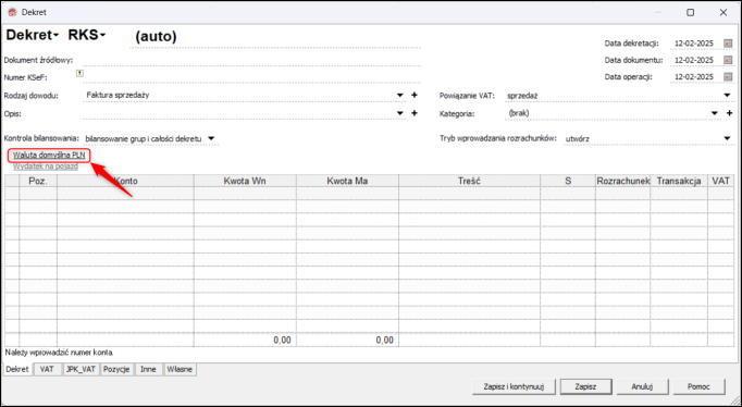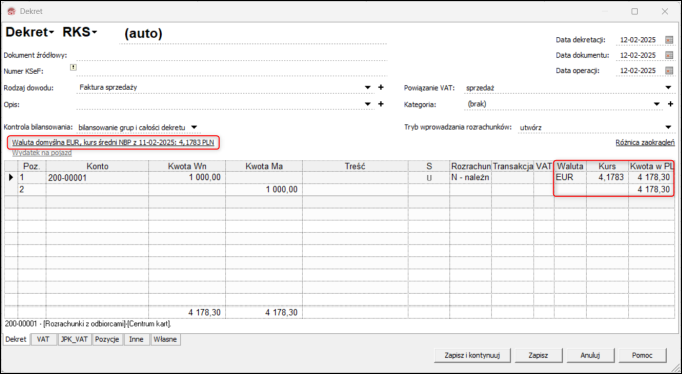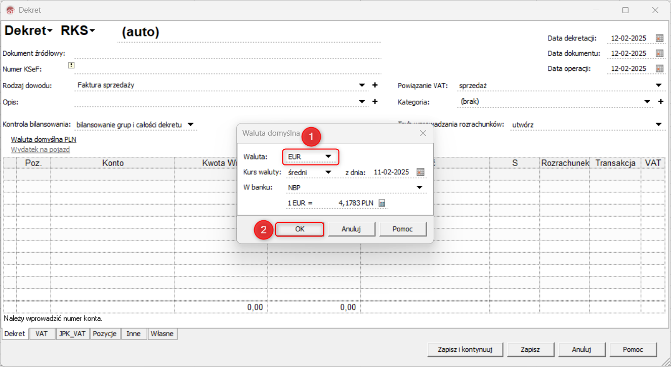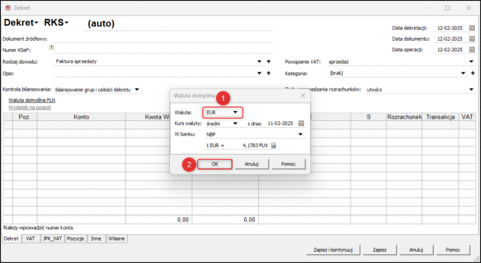 3. Wybrana Waluta oraz jej Kurs zostaną automatycznie przypisane do nowych pozycji dekretu.