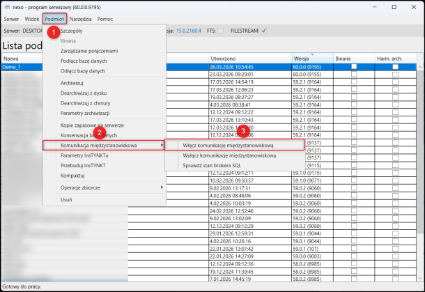 W niektórych przypadkach usługa Brokera SQL może sama się nie włączyć. Dzieje się tak np. wtedy, gdy aktualizację do nowej wersji przeprowadzał użytkownik bez pełnych uprawnień administratora. Aby włączyć Broker SQL, należy wejść do programu serwisowego logując się użytkownikiem SQL posiadającym pełne uprawnienia administratora i skorzystać z operacji Komunikacja międzystanowiskowa – Włącz komunikację międzystanowiskową.