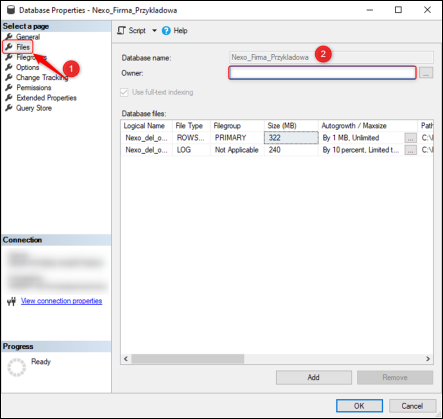 Jeśli baza była tworzona na starej wersji SQL Server (np. SQL2014 lub starszej), to po przejściu na nową, wyższą wersję SQL Server, pliki w bazie mogą nie mieć ustawionego właściciela.