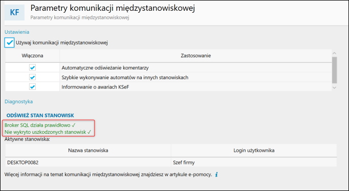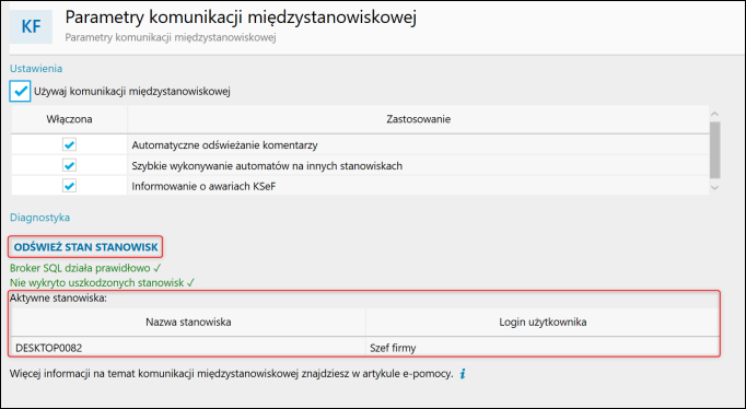 W sekcji Diagnostyka można podejrzeć Aktywne stanowiska wraz z nazwami zalogowanych użytkowników, oraz odświeżyć ich stan.