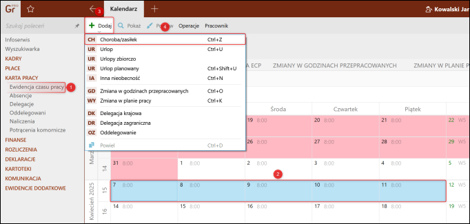 1. Przejść do Ewidencji czasu pracy, zaznaczyć okres choroby i wybrać Dodaj – Choroba/zasiłek.