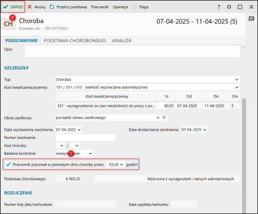 2. Po określeniu podstawowych parametrów absencji zaznaczyć parametr Pracownik pracował w pierwszym dniu choroby przez i podać liczbę godzin. Zatwierdzić dodawanie choroby przyciskiem Zapisz.