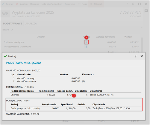 4. Po naliczeniu wynagrodzenia za wskazany okres będzie możliwość weryfikacji wartości powiększenia składników o liczbę godzin przepracowanych.