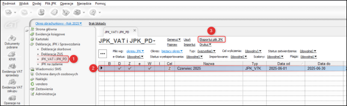 ​1. Przejść do modułu Deklaracje, JPK i SprawozdaniaJPK_VAT i JPK_PD, zaznaczyć zatwierdzony wcześniej plik JPK i wybrać Eksportuj plik JPK.